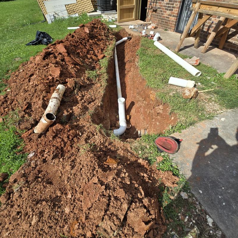 Saving Plumbing LLC replaced a clogged and damaged drain pipe with a new PVC sewer line by digging and accessing the exterior drain system in Atlanta, Georgia.